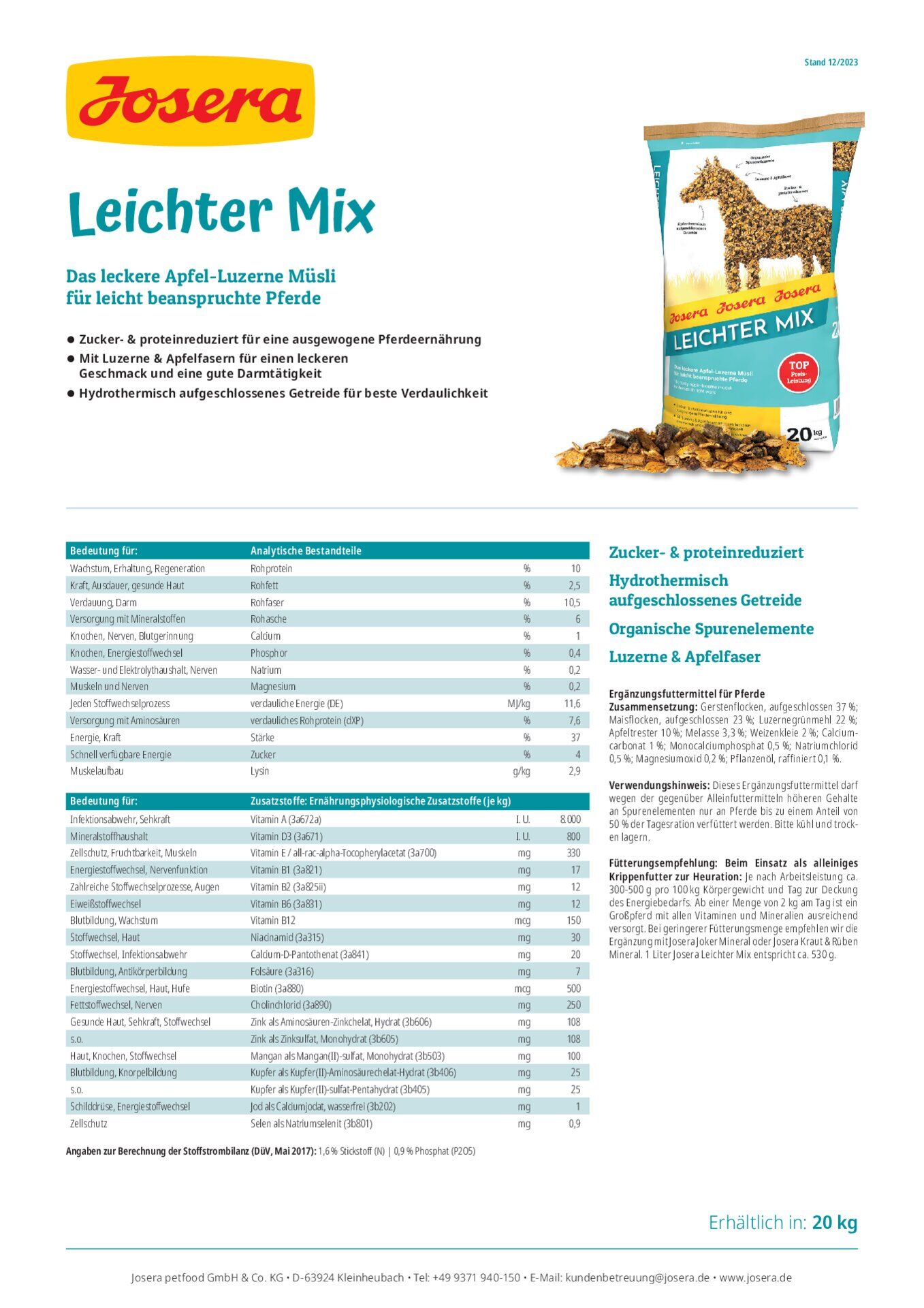 Zusammensetzung Gerstenflocken, aufgeschlossen (37%); Maisflocken, aufgeschlossen (23%); Luzernegrünmehl (22%); Apfeltrester (10%); Melasse (2,6%); Weizenkleie (2%); Calciumcarbonat (1,2%); Pflanzenöl, raffiniert (0,5%); Natriumchlorid (0,5%); Monocalciumphosphat (0,3%); Magnesiumoxid (0,2%)